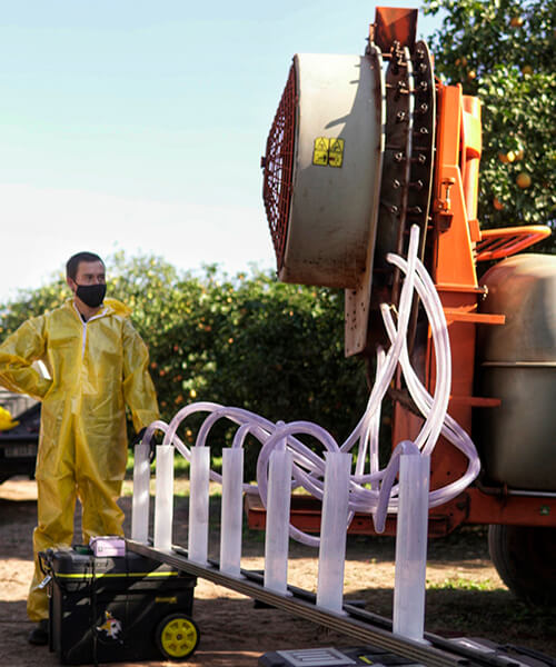 Una vez definida la tasa de aplicación de referencia, debe ajustarse el caudal de aire erogado, de forma tal que sea suficiente para que atraviese la canopia sin demasiado flujo residual (aumento de deriva).