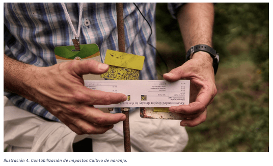Una vez realizado esto, debe colocarse tarjetas hidrosensibles en los sitios de interés de pulverización (según la plaga y el fitosanitario utilizado). Se realiza una pasada de prueba y se chequean los impactos por cm2 logrados.